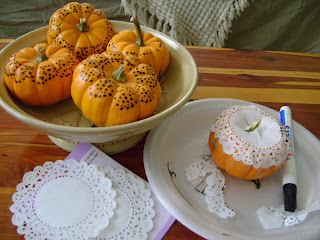 Since I had mini pumpkins, I ran out and bought some small paper doilies, and clipped the center open in a few places. I taped down the doily and gave my 5 year old grandson a paint pen to make a couple. I'm sure it was much easier that way, at least it wasn't as messy as it could have been :) He had fun, and I had him write his name on them.
